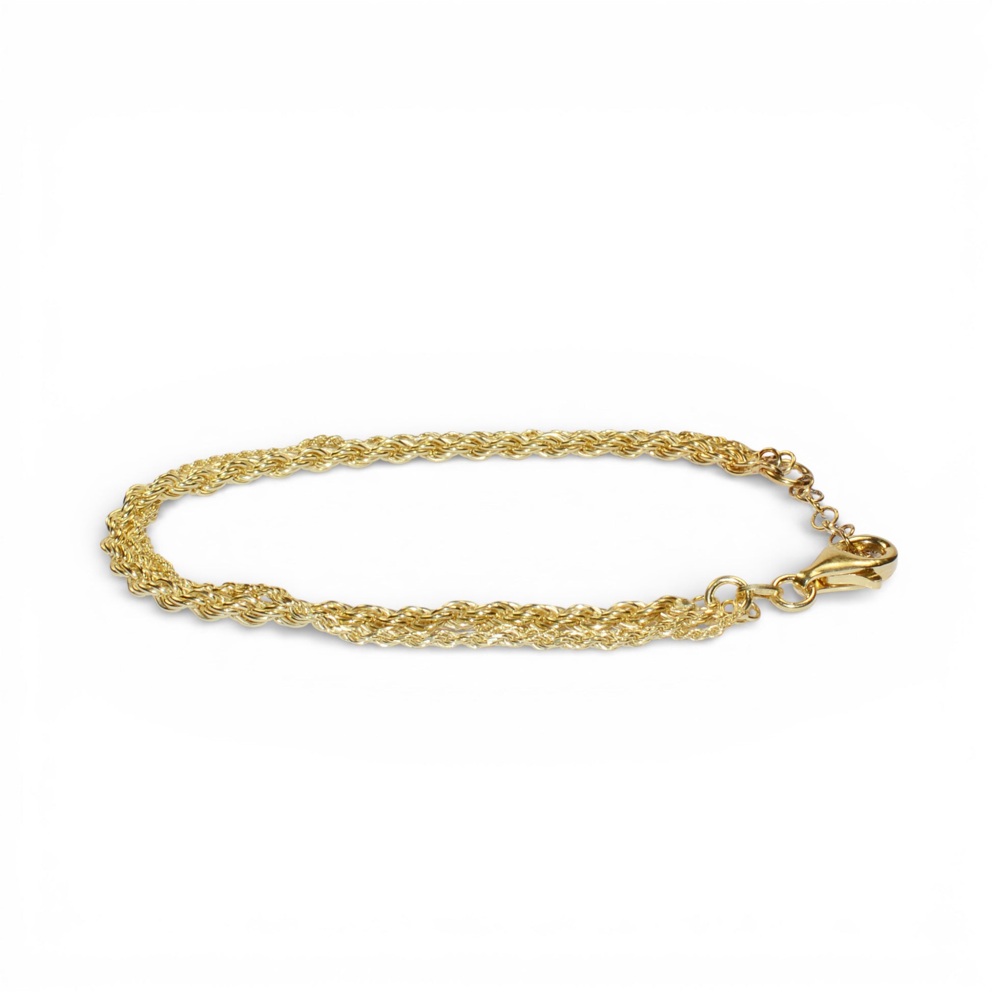 Tre maglie a corda in progressione creano un effetto di movimento elegante su questo bracciale in argento 925 placcato oro. Ogni catenina, più ampia della precedente, cattura la luce con delicatezza, regalando un'armonia visiva sofisticata.
